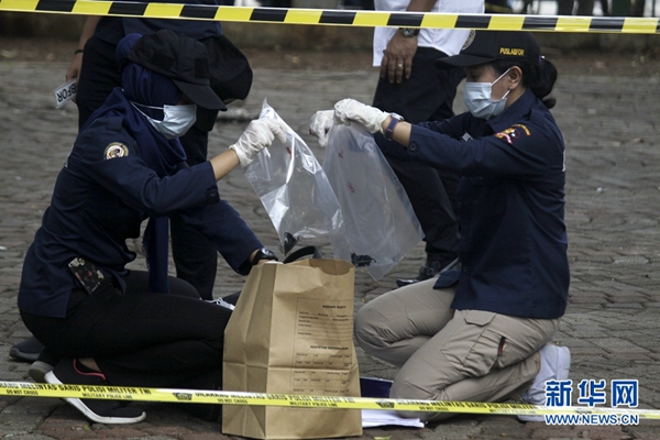 12月3日,在印度尼西亞雅加達,警察在爆炸現(xiàn)場收集物證。新華社發(fā)(阿迪蒂亞·伊拉萬 攝)
