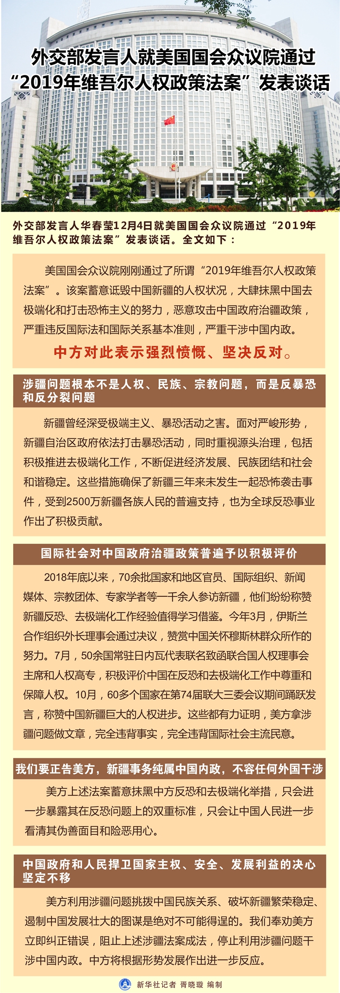 新華社北京12月4日電 外交部發(fā)言人華春瑩4日就美國(guó)國(guó)會(huì)眾議院通過“2019年維吾爾人權(quán)政策法案”發(fā)表談話。全文如下: