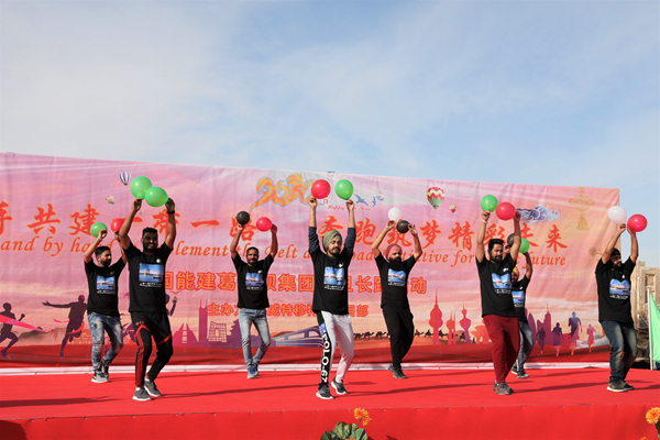 來自中國、科威特、埃及、土耳其、印度、巴基斯坦等16個國家的員工們組成了20個方陣,他們身著印有項(xiàng)目地塊顏色和形狀的文化衫,手持16個國家的國旗,在長達(dá)6公里的項(xiàng)目工地道路上長跑。