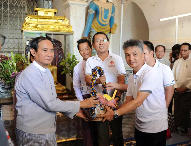 ▲2018年9月,中緬在修復(fù)因地震受損的蒲甘佛塔方面的合作正式啟動。圖為2019年8月3日,緬甸總統(tǒng)溫敏(左一)來到蒲甘他冰瑜寺,慰問中方專家及工作組。
