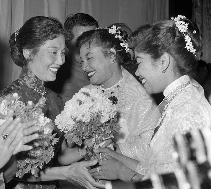 ▲1961年1月6日,中國電影周在仰光總統(tǒng)電影院舉行開幕式。圖為緬甸電影演員向中國電影演員張瑞芳(左)獻花。