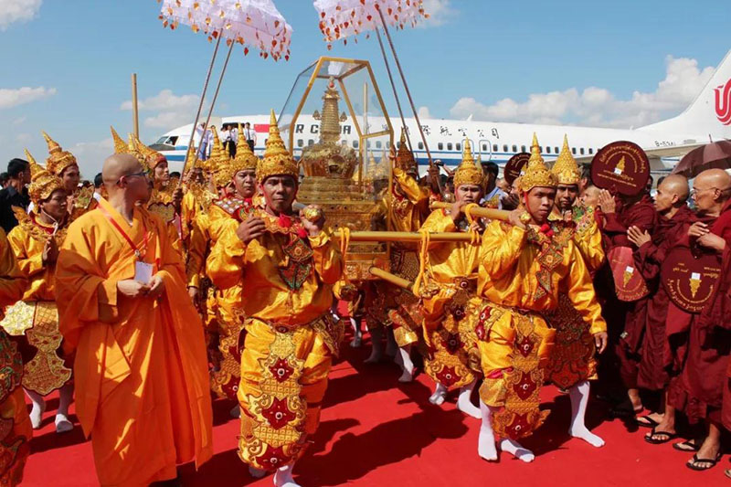 ▲2011年11月6日,北京西山靈光寺佛牙舍利塔中供奉的佛牙舍利抵達內(nèi)比都機場,開始為期48天的緬甸供奉巡禮。