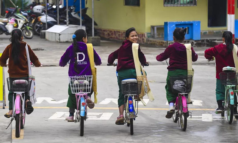 ▲國境線將云南省瑞麗市姐相鄉(xiāng)一個村寨一分為二,中方一側(cè)稱銀井,緬方一側(cè)稱芒秀,是典型的“一寨兩國”村落。圖為銀井小學(xué)幾位緬籍學(xué)生騎車回家,跨過銀井邊防口岸國境線。