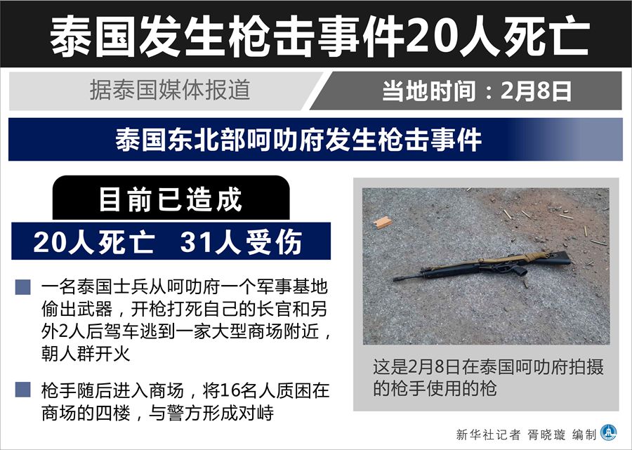 泰國(guó)媒體8日援引泰國(guó)國(guó)防部發(fā)言人空奇的話報(bào)道說,此次槍擊事件已造成20人死亡。另?yè)?jù)媒體報(bào)道,槍擊事件的傷者已達(dá)31人。