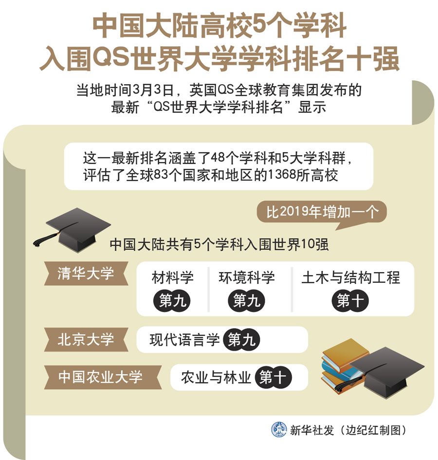 圖表:中國(guó)大陸高校5個(gè)學(xué)科入圍QS世界大學(xué)學(xué)科排名十強(qiáng) 新華社發(fā) 邊紀(jì)紅 制圖