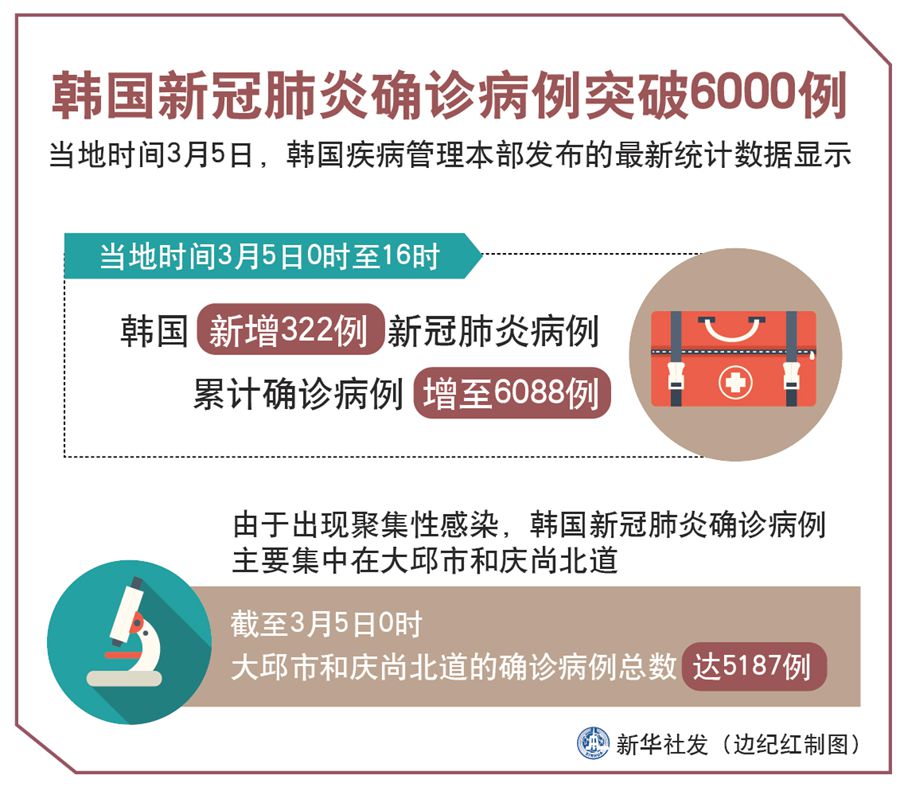 新華社首爾3月5日電(記者陸睿 耿學(xué)鵬)韓國疾病管理本部5日發(fā)布的最新統(tǒng)計數(shù)據(jù)顯示,當?shù)貢r間5日0時至16時,韓國新增322例新冠肺炎病例,累計確診病例增至6088例。