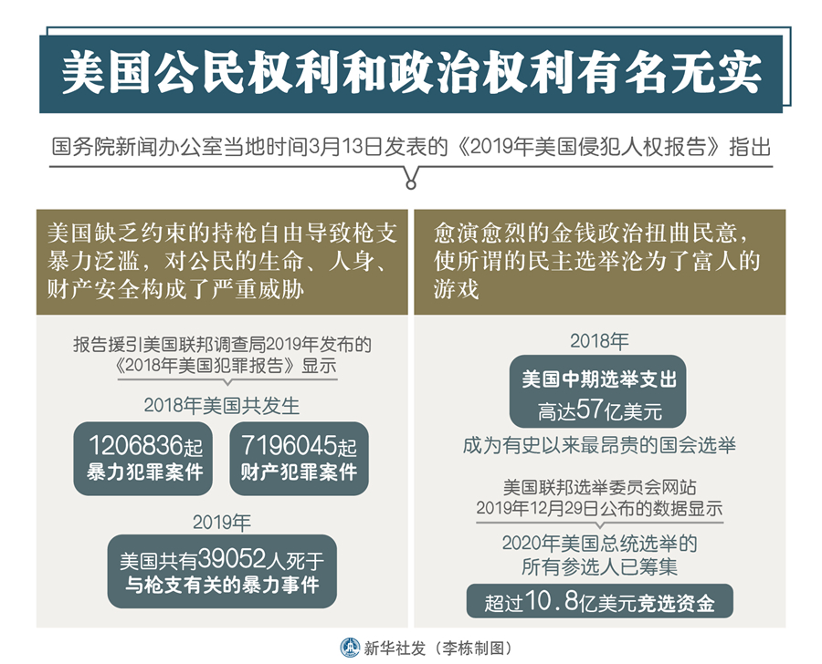 新華社北京3月13日電(記者王子銘、賈釗)國務院新聞辦公室13日發(fā)表的《2019年美國侵犯人權(quán)報告》指出,美國缺乏約束的持槍自由導致槍支暴力泛濫,對公民的生命、人身、財產(chǎn)安全構(gòu)成了嚴重威脅;愈演愈烈的金錢政治扭曲民意,使所謂的民主選舉淪為了富人的游戲。