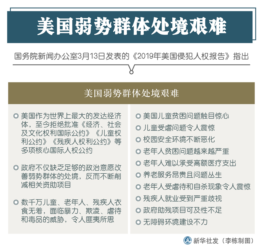 新華社北京3月13日電(記者王鵬、賈釗)國務(wù)院新聞辦13日發(fā)表的《2019年美國侵犯人權(quán)報告》指出,美國弱勢群體處境艱難。