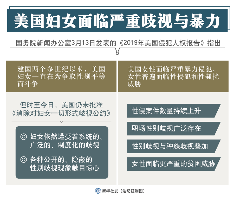 新華社北京3月13日電(記者王鵬、張?jiān)讫垼﹪鴦?wù)院新聞辦13日發(fā)表的《2019年美國侵犯人權(quán)報告》指出,美國婦女面臨嚴(yán)重歧視與暴力。