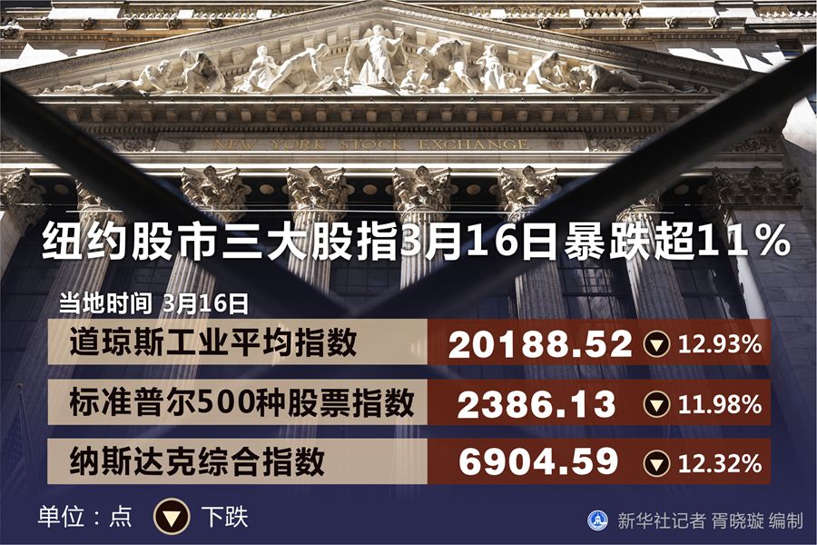 收盤時,紐約股市三大股指均暴跌超過11%,道指創(chuàng)下1987年“黑色星期一”以來的最大單日跌幅,美股自本月9日以來第三次觸發(fā)熔斷機(jī)制。