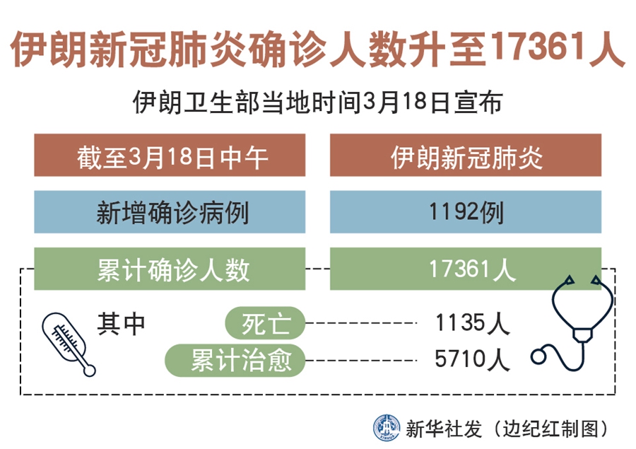 新華社德黑蘭3月18日電(記者陳霖)伊朗衛(wèi)生部18日宣布,截至18日中午,伊朗新增新冠肺炎確診病例1192例,累計(jì)確診人數(shù)達(dá)到17361人,其中1135人死亡,累計(jì)治愈5710人。