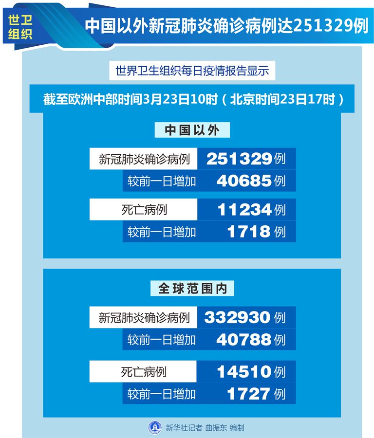 世衛(wèi)組織每日疫情報告顯示,截至歐洲中部時間23日10時(北京時間23日17時),中國以外新冠肺炎確診病例較前一日增加40685例,達(dá)到251329例;中國以外死亡病例較前一日增加1718例,達(dá)到11234例。