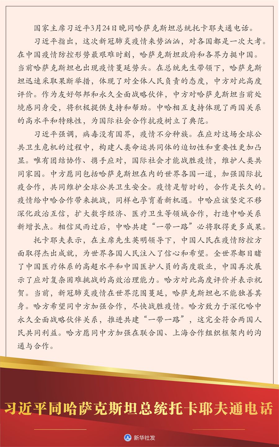 習(xí)近平指出,這次新冠肺炎疫情來(lái)勢(shì)洶洶,對(duì)各國(guó)都是一次大考。在中國(guó)疫情防控形勢(shì)最艱難時(shí)刻,哈薩克斯坦政府和各界力挺中國(guó)。當(dāng)前哈薩克斯坦也出現(xiàn)疫情蔓延勢(shì)頭。在總統(tǒng)先生帶領(lǐng)下,哈薩克斯坦迅速采取果斷舉措,體現(xiàn)了對(duì)全體人民負(fù)責(zé)的態(tài)度,中方對(duì)此高度評(píng)價(jià)。作為友好鄰邦和永久全面戰(zhàn)略伙伴,中方對(duì)哈薩克斯坦當(dāng)前處境感同身受,將積極提供支持和幫助。中哈相互支持體現(xiàn)了兩國(guó)關(guān)系的高水平和特殊性,為國(guó)際社會(huì)合作抗疫樹立了典范。