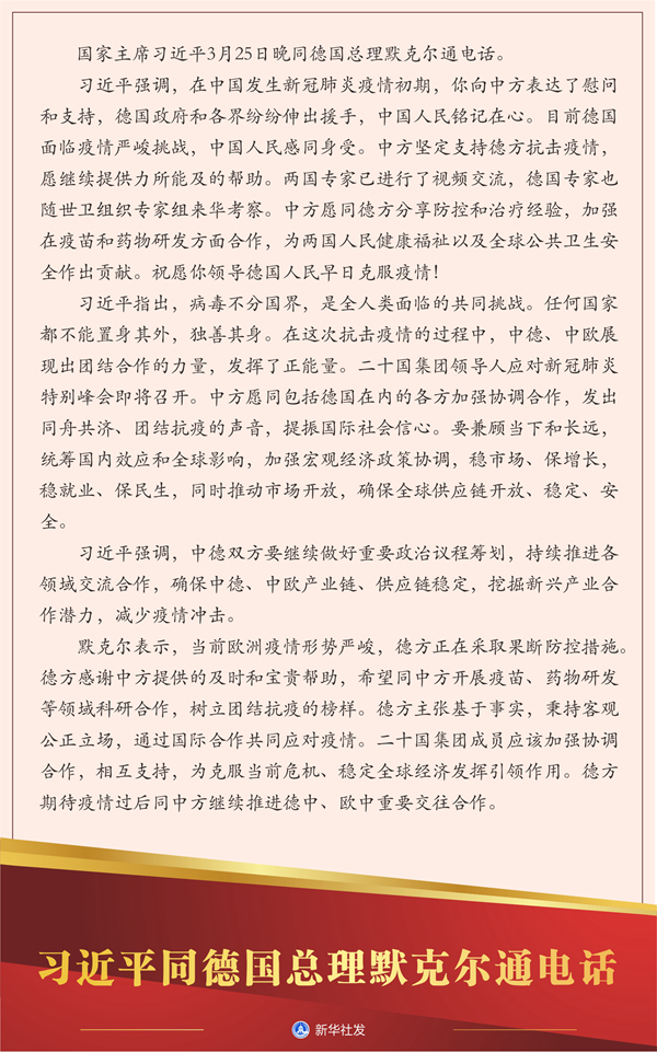 習(xí)近平強調(diào),在中國發(fā)生新冠肺炎疫情初期,你向中方表達了慰問和支持,德國政府和各界紛紛伸出援手,中國人民銘記在心。目前德國面臨疫情嚴(yán)峻挑戰(zhàn),中國人民感同身受。中方堅定支持德方抗擊疫情,愿繼續(xù)提供力所能及的幫助。兩國專家已進行了視頻交流,德國專家也隨世衛(wèi)組織專家組來華考察。中方愿同德方分享防控和治療經(jīng)驗,加強在疫苗和藥物研發(fā)方面合作,為兩國人民健康福祉以及全球公共衛(wèi)生安全作出貢獻。祝愿你領(lǐng)導(dǎo)德國人民早日克服疫情!