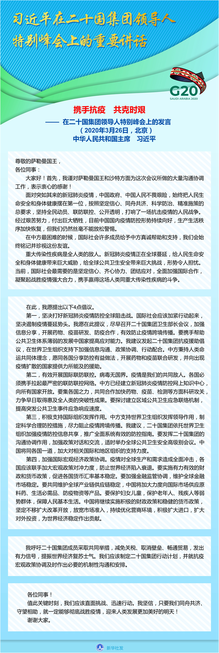 二十國集團領導人應對新冠肺炎特別峰會由沙特主辦,以視頻方式舉行,旨在推動全球合作應對疫情、穩(wěn)定世界經(jīng)濟。