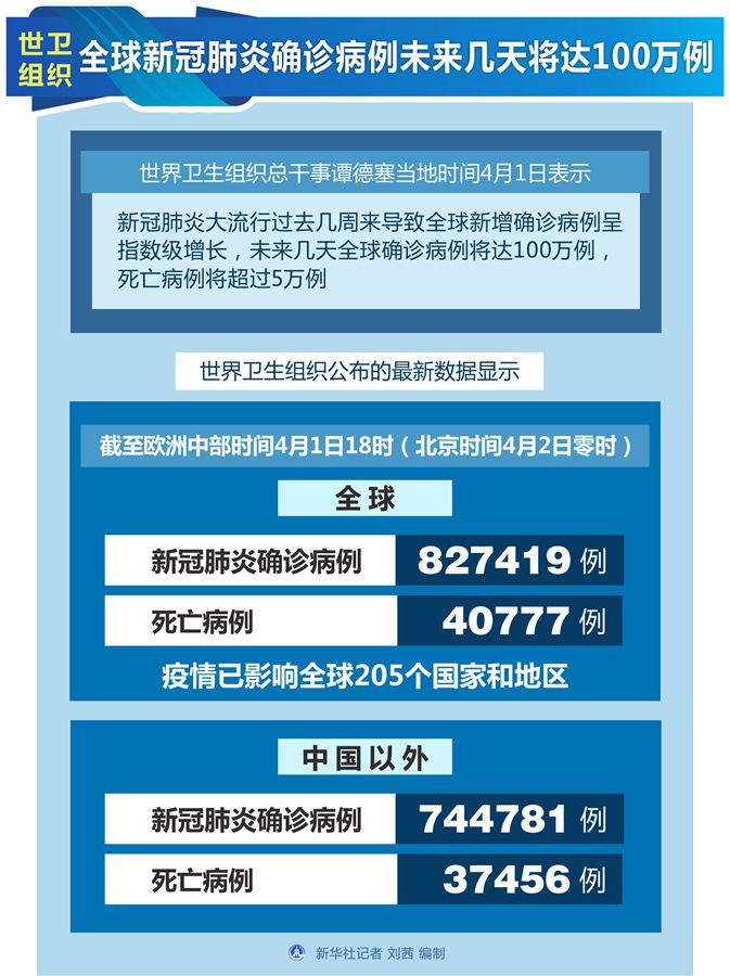 新華社日內(nèi)瓦4月1日電(記者劉曲)世界衛(wèi)生組織總干事譚德塞4月1日表示,新冠肺炎大流行過(guò)去幾周來(lái)導(dǎo)致全球新增確診病例呈指數(shù)級(jí)增長(zhǎng),未來(lái)幾天全球確診病例將達(dá)100萬(wàn)例,死亡病例將超過(guò)5萬(wàn)例。