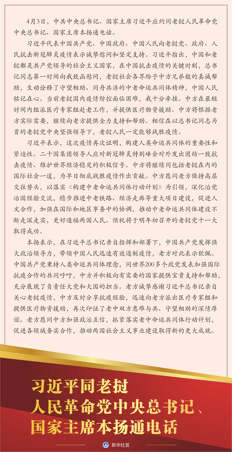 習(xí)近平代表中國共產(chǎn)黨、中國政府、中國人民向老撾黨、政府、人民抗擊新冠肺炎疫情表示誠摯慰問和堅(jiān)定支持。習(xí)近平指出,中國和老撾都是共產(chǎn)黨領(lǐng)導(dǎo)的社會主義國家,在中國抗擊疫情的關(guān)鍵時(shí)刻,總書記同志第一時(shí)間向我致函慰問,老撾社會各界給予中方兄弟般的真誠幫助,生動詮釋了守望相助、同舟共濟(jì)的中老命運(yùn)共同體精神,中國人民銘記在心。當(dāng)前老撾國內(nèi)疫情防控面臨困難,我十分牽掛。中方在最短時(shí)間內(nèi)組派醫(yī)療專家組赴老工作,并提供醫(yī)療物資援助。中方將根據(jù)老方實(shí)際需要,繼續(xù)向老方提供全力支持和幫助。相信在以總書記同志為首的老撾黨中央堅(jiān)強(qiáng)領(lǐng)導(dǎo)下,老撾人民一定能夠戰(zhàn)勝疫情。