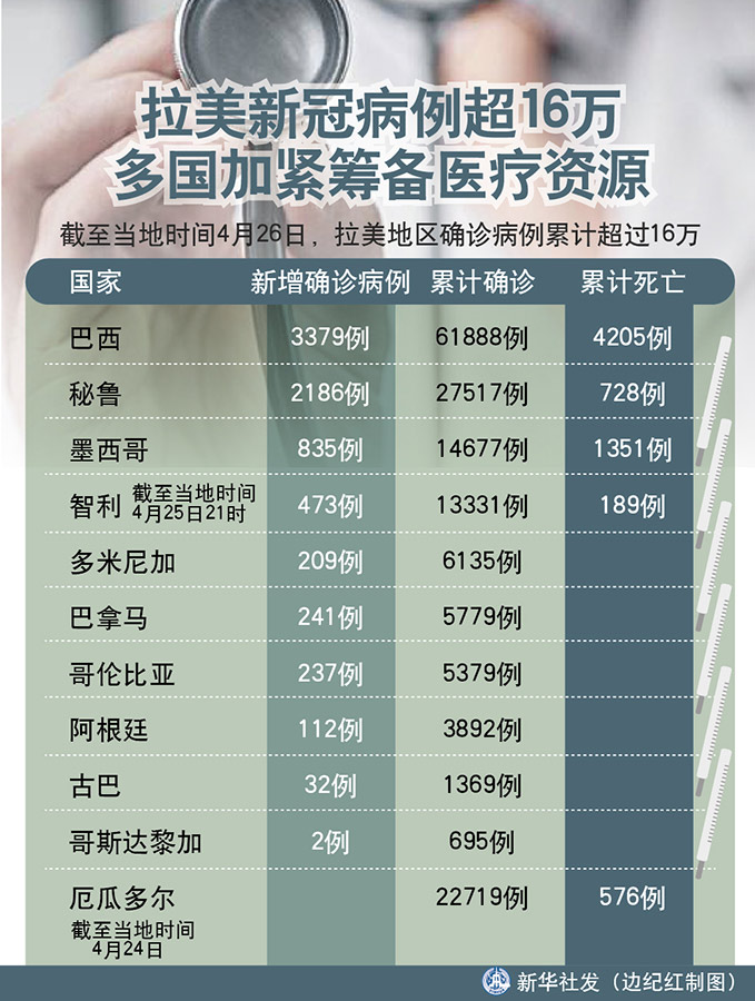 新華社墨西哥城4月26日電 綜合新華社駐拉美地區(qū)記者報道:新冠疫情在拉美多國持續(xù)蔓延。截至當?shù)貢r間26日,拉美地區(qū)確診病例累計超過16萬。多國政府為應對疫情,加緊籌備醫(yī)療物資,增派醫(yī)療人員。
