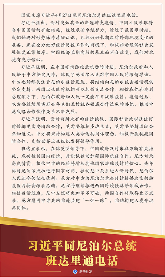 習(xí)近平強(qiáng)調(diào),在中國疫情防控最吃勁的時刻,尼泊爾政府和人民給予中方堅定支持,體現(xiàn)了尼泊爾人民對中國人民的深情厚誼。中方也始終關(guān)注著尼泊爾疫情發(fā)展,將繼續(xù)向尼泊爾抗擊疫情提供堅定支持,兩國衛(wèi)生醫(yī)療機(jī)構(gòu)可以加強(qiáng)交流合作。相信在你和奧利總理領(lǐng)導(dǎo)下,尼泊爾政府和人民一定能早日戰(zhàn)勝疫情。疫情過后,雙方要繼續(xù)落實好去年我們互訪就各領(lǐng)域合作達(dá)成的共識,推動中尼戰(zhàn)略合作伙伴關(guān)系不斷發(fā)展。