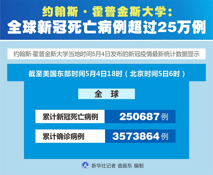 新華社紐約5月4日電? 美國約翰斯·霍普金斯大學(xué)4日發(fā)布的新冠疫情最新統(tǒng)計(jì)數(shù)據(jù)顯示,全球累計(jì)新冠死亡病例超過25萬例。
