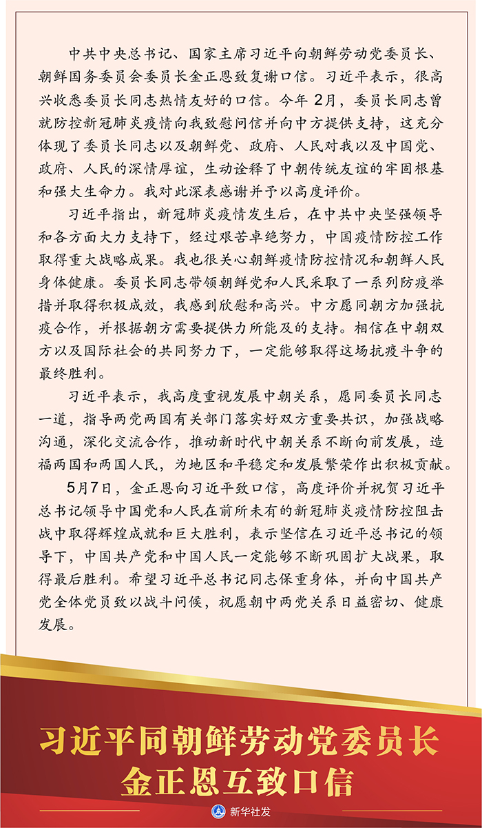 5月7日,金正恩向習(xí)近平致口信,高度評價并祝賀習(xí)近平總書記領(lǐng)導(dǎo)中國黨和人民在前所未有的新冠肺炎疫情防控阻擊戰(zhàn)中取得輝煌成就和巨大勝利,表示堅信在習(xí)近平總書記的領(lǐng)導(dǎo)下,中國共產(chǎn)黨和中國人民一定能夠不斷鞏固擴大戰(zhàn)果,取得最后勝利。希望習(xí)近平總書記同志保重身體,并向中國共產(chǎn)黨全體黨員致以戰(zhàn)斗問候,祝愿朝中兩黨關(guān)系日益密切、健康發(fā)展。