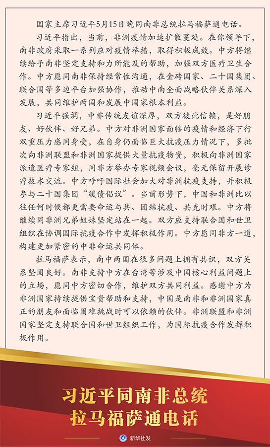 習(xí)近平指出,當前,非洲疫情加速擴散蔓延。在你領(lǐng)導(dǎo)下,南非政府采取一系列應(yīng)對疫情舉措,取得積極成效。中方將繼續(xù)給予南非堅定支持和力所能及的幫助,加強雙方醫(yī)療衛(wèi)生合作。中方愿同南非保持經(jīng)常性溝通,在金磚國家、二十國集團、聯(lián)合國等多邊平臺加強協(xié)作,推動中南全面戰(zhàn)略伙伴關(guān)系深入發(fā)展,共同維護兩國和發(fā)展中國家根本利益。