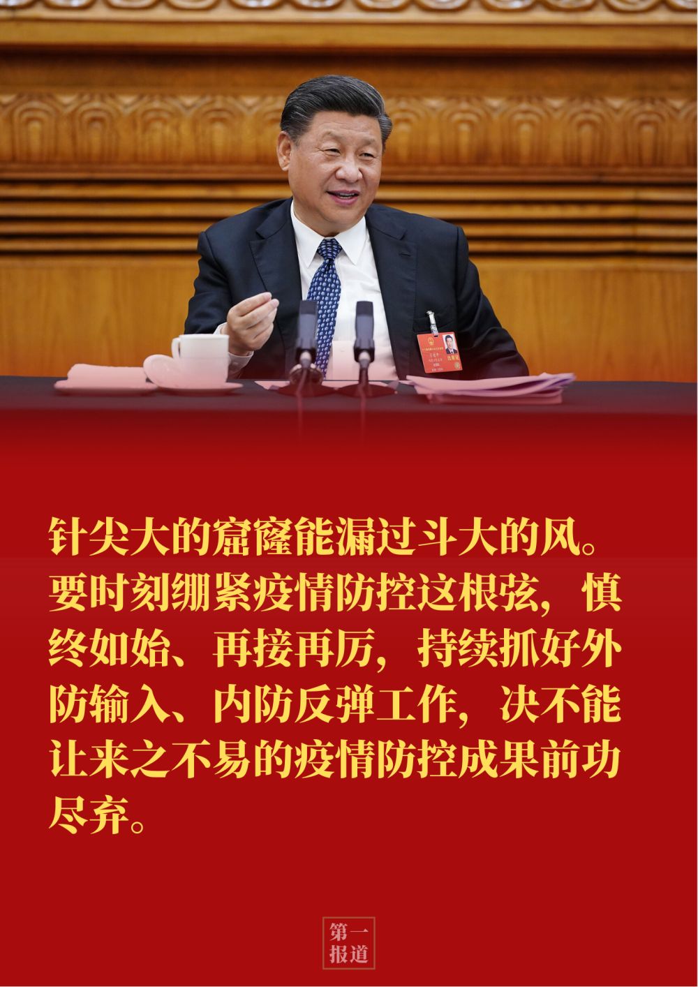 習(xí)近平指出:“針尖大的窟窿能漏過斗大的風(fēng)。要時刻繃緊疫情防控這根弦,慎終如始、再接再厲,持續(xù)抓好外防輸入、內(nèi)防反彈工作,決不能讓來之不易的疫情防控成果前功盡棄?!?