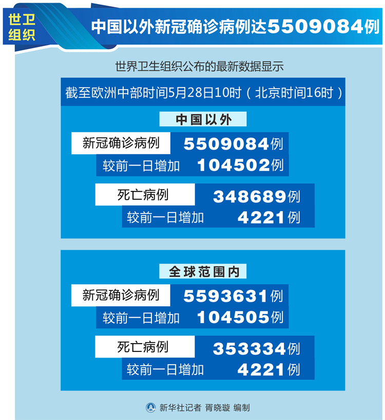 世衛(wèi)組織每日疫情報告顯示,截至歐洲中部時間28日10時(北京時間16時),中國以外新冠確診病例較前一日增加104502例,達(dá)到5509084例;中國以外死亡病例較前一日增加4221例,達(dá)到348689例。