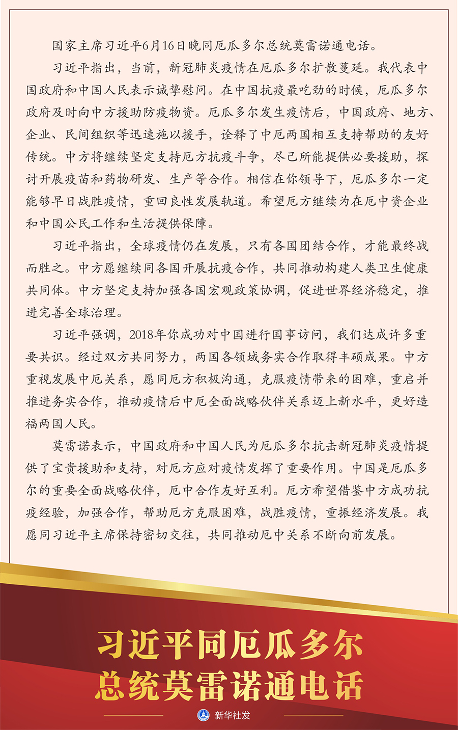 新華社北京6月16日電? 國(guó)家主席習(xí)近平6月16日晚同厄瓜多爾總統(tǒng)莫雷諾通電話。
