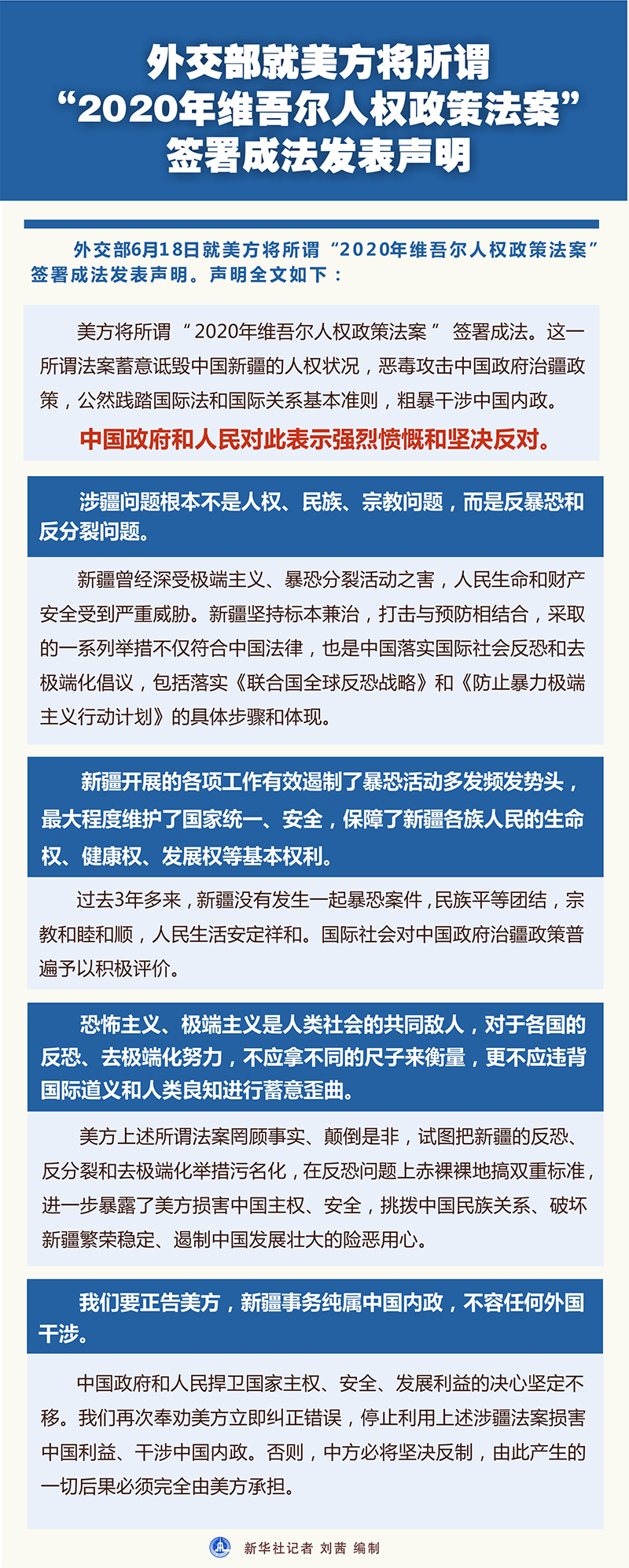新華社北京6月18日電? 外交部18日就美方將所謂“2020年維吾爾人權(quán)政策法案”簽署成法發(fā)表聲明。聲明全文如下: