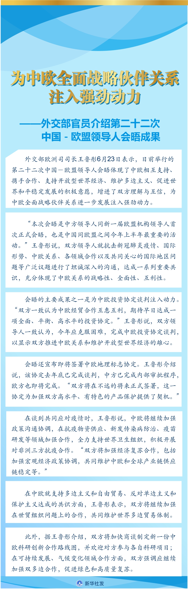 新華社北京6月23日電(記者王賓)外交部歐洲司司長王魯彤23日表示,日前舉行的第二十二次中國-歐盟領導人會晤體現(xiàn)了中歐相互支持、攜手合作、支持開放型世界經(jīng)濟、維護多邊主義、促進世界和平穩(wěn)定發(fā)展的積極意愿,增進了雙方理解與互信,為中歐全面戰(zhàn)略伙伴關系進一步發(fā)展注入強勁動力。