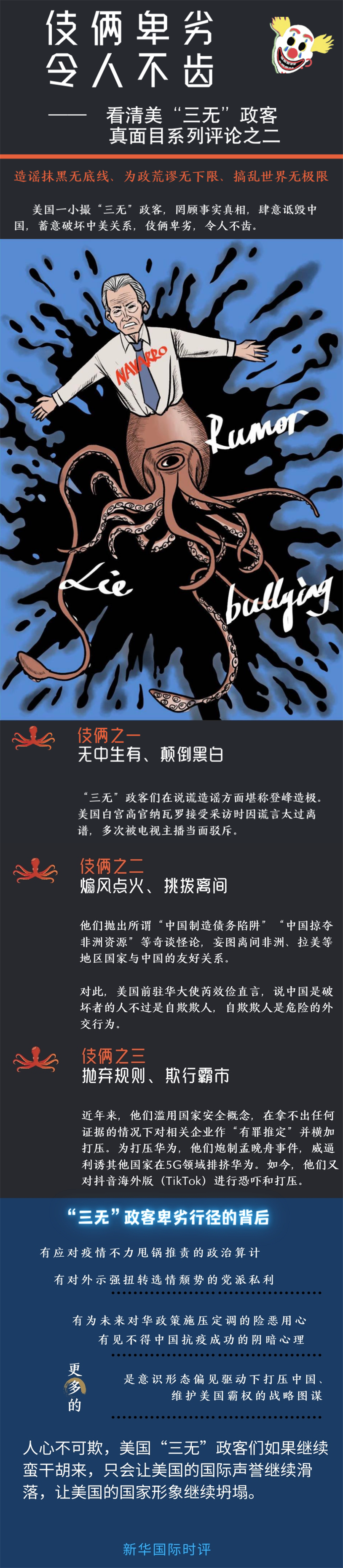 在這些“三無”政客卑劣行徑的背后,有應(yīng)對疫情不力甩鍋推責的政治算計,有對外示強扭轉(zhuǎn)選情頹勢的黨派私利,有為未來對華政策施壓定調(diào)的險惡用心,有見不得中國抗疫成功的陰暗心理,更多的是意識形態(tài)偏見驅(qū)動下打壓中國、維護美國霸權(quán)的戰(zhàn)略圖謀。