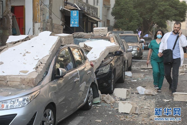 8月4日,在黎巴嫩首都貝魯特,人們從爆炸中受損的車輛旁走過。 新華社發(fā)(比拉爾·賈維希 攝)