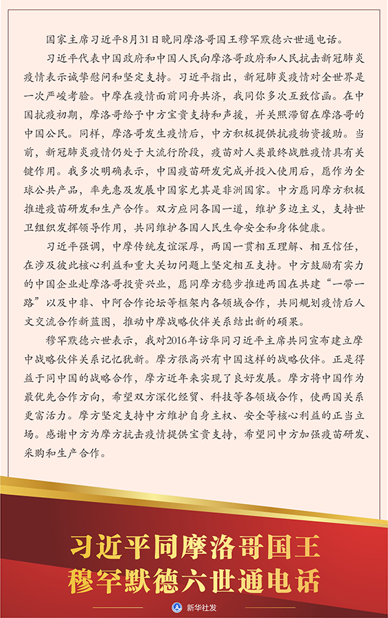 習(xí)近平代表中國政府和中國人民向摩洛哥政府和人民抗擊新冠肺炎疫情表示誠摯慰問和堅定支持。習(xí)近平指出,新冠肺炎疫情對全世界是一次嚴峻考驗。中摩在疫情面前同舟共濟,我同你多次互致信函。在中國抗疫初期,摩洛哥給予中方寶貴支持和聲援,并關(guān)照滯留在摩洛哥的中國公民。同樣,摩洛哥發(fā)生疫情后,中方積極提供抗疫物資援助。當(dāng)前,新冠肺炎疫情仍處于大流行階段,疫苗對人類最終戰(zhàn)勝疫情具有關(guān)鍵作用。我多次明確表示,中國疫苗研發(fā)完成并投入使用后,愿作為全球公共產(chǎn)品,率先惠及發(fā)展中國家尤其是非洲國家。中方愿同摩方積極推進疫苗研發(fā)和生產(chǎn)合作。雙方應(yīng)同各國一道,維護多邊主義,支持世衛(wèi)組織發(fā)揮領(lǐng)導(dǎo)作用,共同維護各國人民生命安全和身體健康。