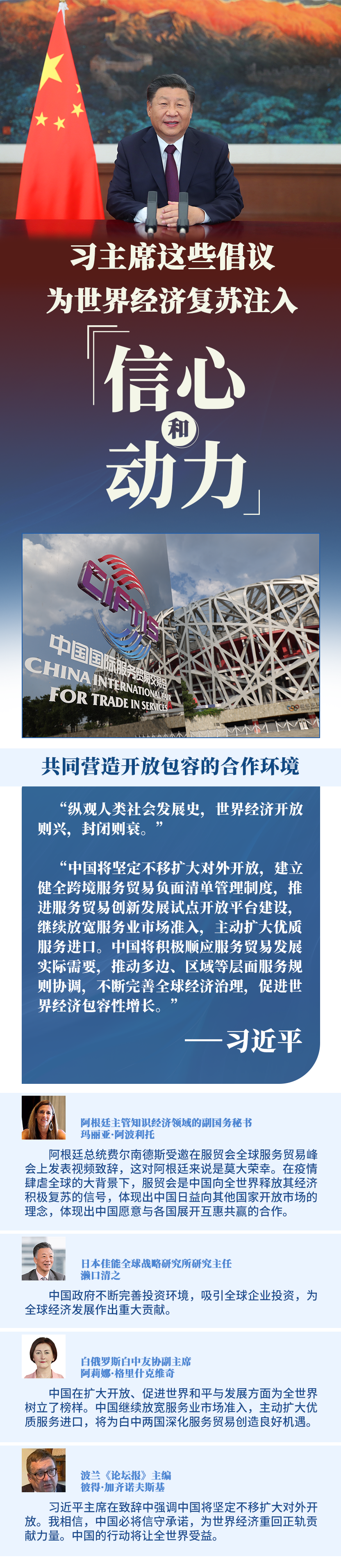 在全球范圍新冠疫情尚未得到全面控制、經(jīng)濟(jì)全球化遭遇逆流的背景下,習(xí)主席就促進(jìn)全球服務(wù)業(yè)開放合作提出3點(diǎn)倡議,為推動(dòng)世界經(jīng)濟(jì)盡快復(fù)蘇注入信心和動(dòng)力,向國(guó)際社會(huì)展現(xiàn)中國(guó)負(fù)責(zé)任大國(guó)的作為和擔(dān)當(dāng)。