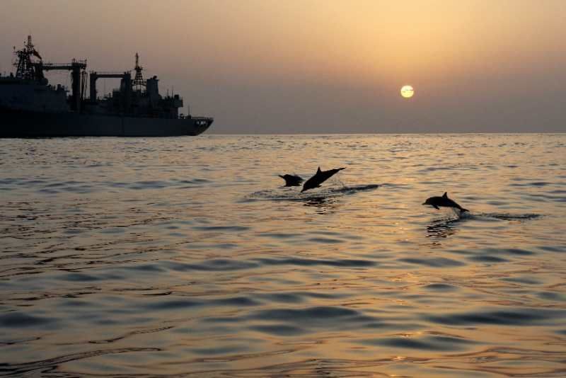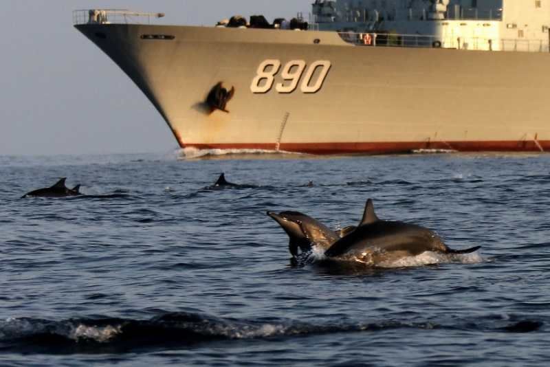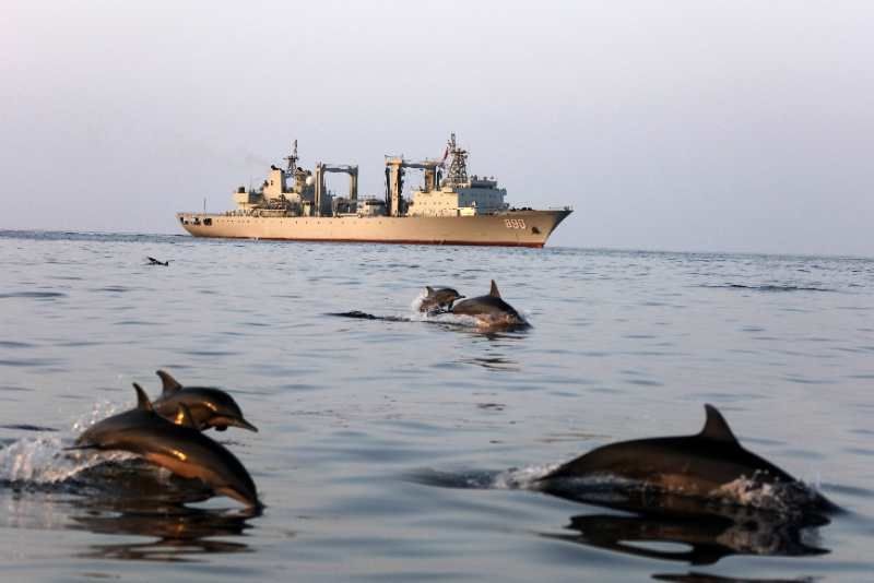 中國海軍赴亞丁灣索馬里海域護(hù)航編隊(duì)始終秉持海洋命運(yùn)共同體理念,堅(jiān)持人與大海和諧相處,注重生態(tài)環(huán)境保護(hù),贏得大自然積極回報(bào),經(jīng)常出現(xiàn)編隊(duì)艦艇航行時(shí)有成群海豚伴航、待機(jī)集結(jié)時(shí)有各類魚群相伴的和諧場(chǎng)景。