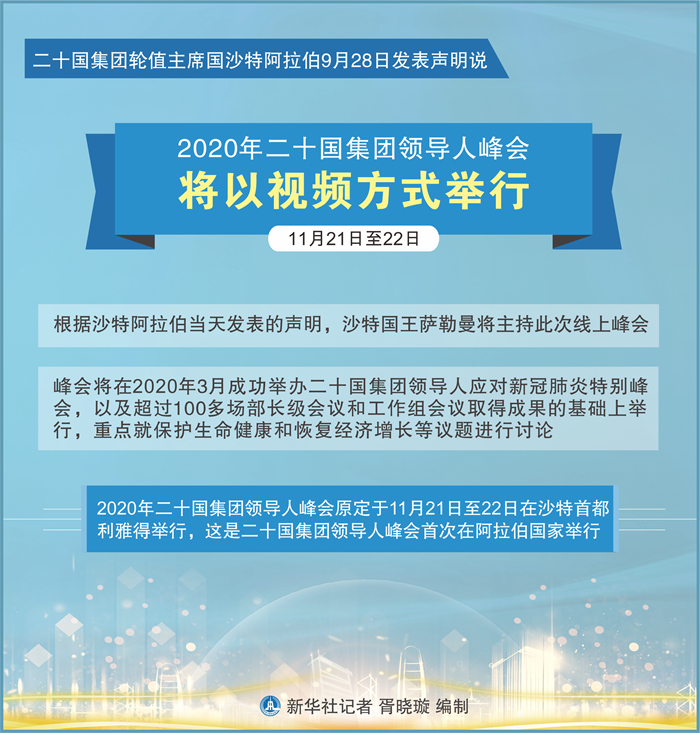 根據(jù)沙特阿拉伯當(dāng)天發(fā)表的聲明,沙特國(guó)王薩勒曼將主持此次線上峰會(huì)。峰會(huì)將在今年3月成功舉辦二十國(guó)集團(tuán)領(lǐng)導(dǎo)人應(yīng)對(duì)新冠肺炎特別峰會(huì),以及超過(guò)100多場(chǎng)部長(zhǎng)級(jí)會(huì)議和工作組會(huì)議取得成果的基礎(chǔ)上舉行,重點(diǎn)就保護(hù)生命健康和恢復(fù)經(jīng)濟(jì)增長(zhǎng)等議題進(jìn)行討論。