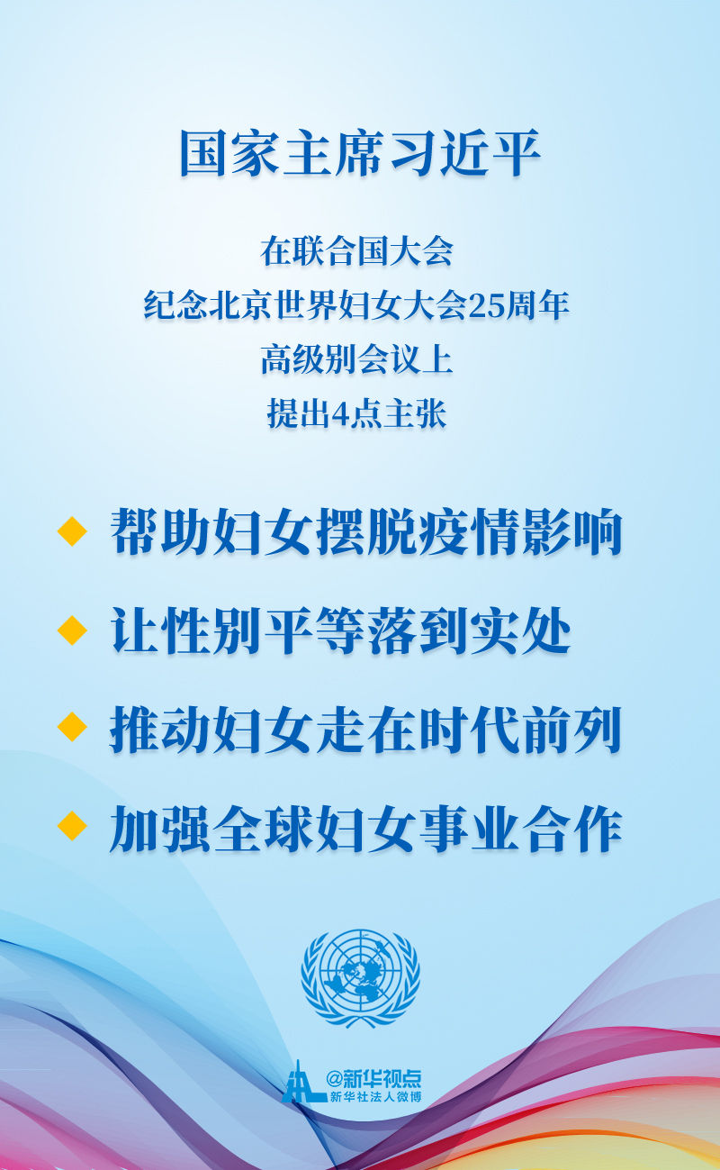 10月1日,聯(lián)合國大會(huì)紀(jì)念北京世界婦女大會(huì)25周年高級(jí)別會(huì)議舉行,習(xí)近平主席出席會(huì)議并發(fā)表講話。