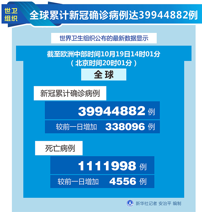 世衛(wèi)組織網站最新數據顯示,截至歐洲中部時間19日14時01分(北京時間20時01分),全球確診病例較前一日增加338096例,達到39944882例;死亡病例增加4556例,達到1111998例。