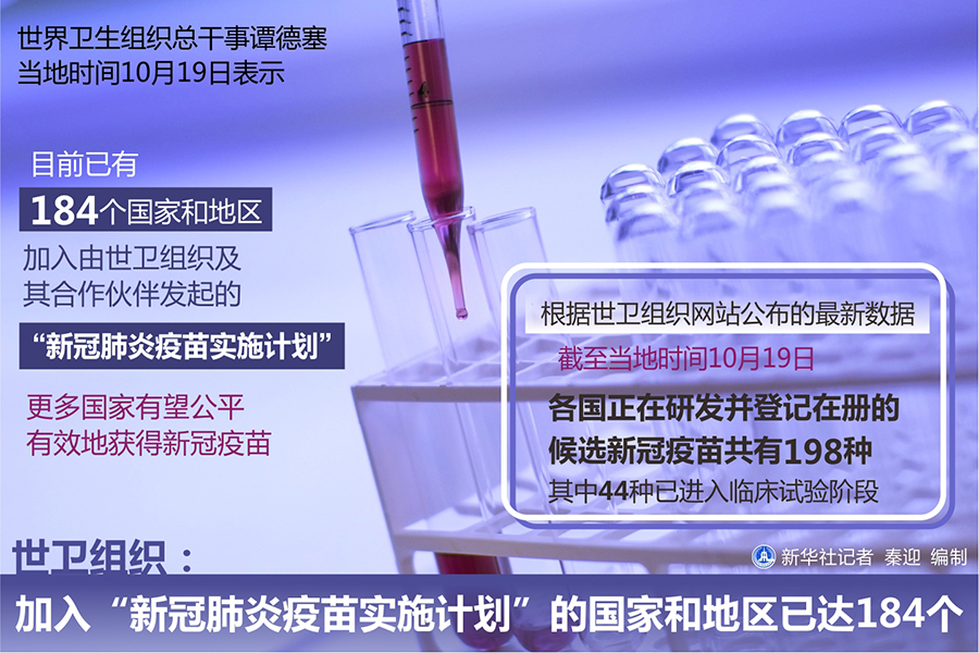 新華社日內(nèi)瓦10月19日電(記者聶曉陽 陳俊俠)世界衛(wèi)生組織總干事譚德塞19日表示,目前已有184個國家和地區(qū)加入由世衛(wèi)組織及其合作伙伴發(fā)起的“新冠肺炎疫苗實施計劃”,更多國家有望公平有效地獲得新冠疫苗。