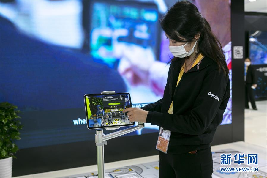11月5日,在第三屆進(jìn)博會服務(wù)貿(mào)易展區(qū),德勤公司在中國首發(fā)“德勤小黃鴨智能工廠”,工作人員通過AR(增強現(xiàn)實)技術(shù)展示智能工廠的應(yīng)用場景。 新華社記者 王翔 攝