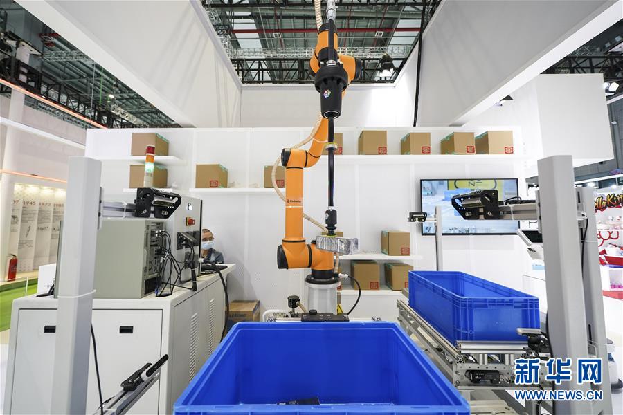 11月5日在第三屆進(jìn)博會服務(wù)貿(mào)易展區(qū)拍攝的物流分揀機器人。新華社記者 張豪夫 攝