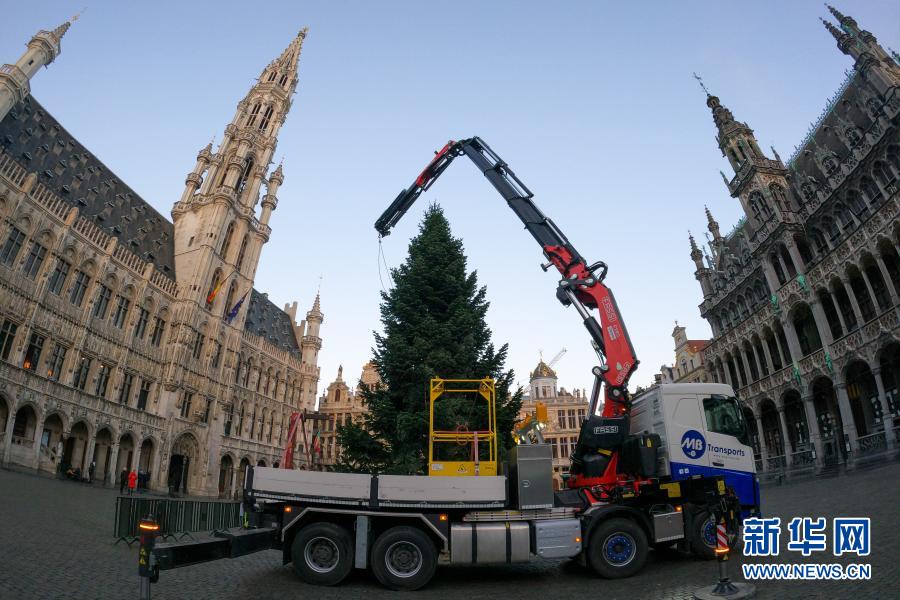 這是11月19日在比利時(shí)布魯塞爾大廣場(chǎng)拍攝的圣誕樹安裝現(xiàn)場(chǎng)。