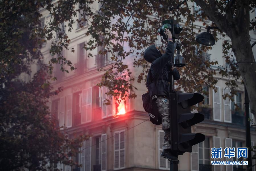 11月28日,一名男子在法國(guó)巴黎的游行示威中爬上桿子,向攝像頭噴漆。