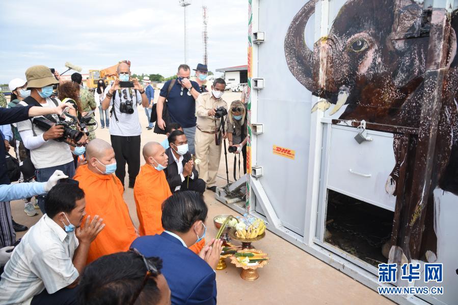 11月30日,在柬埔寨暹粒國(guó)際機(jī)場(chǎng),僧人為大象“卡萬(wàn)”祈福。