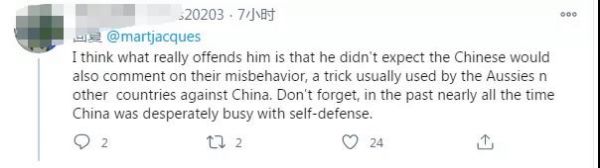 在這條推特下邊,許多網(wǎng)友為馬丁·雅克點(diǎn)贊。其中一位網(wǎng)友說(shuō)道:“我認(rèn)為真正讓他惱火的是,他沒(méi)想到中國(guó)人也會(huì)對(duì)他們的不當(dāng)行為發(fā)表評(píng)論,這是澳大利亞人和其他國(guó)家對(duì)付中國(guó)的慣用伎倆。別忘了,在過(guò)去幾乎所有的時(shí)間里,中國(guó)都在拼命地進(jìn)行自衛(wèi)。”