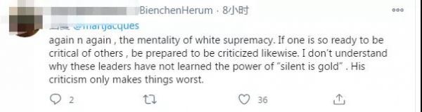 “又一次,白人至上的心態(tài)。如果一個(gè)人準(zhǔn)備好批評(píng)別人,也要準(zhǔn)備好同樣地被批評(píng)。我不明白為什么這些領(lǐng)導(dǎo)人沒(méi)有學(xué)會(huì)‘沉默就是金子’的力量。他的批評(píng)只會(huì)讓事情變得更糟?!?/font>