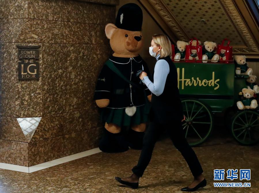 12月2日,一名戴口罩的女子走在英國(guó)倫敦重新開(kāi)門(mén)營(yíng)業(yè)的哈羅德百貨商場(chǎng)內(nèi)。