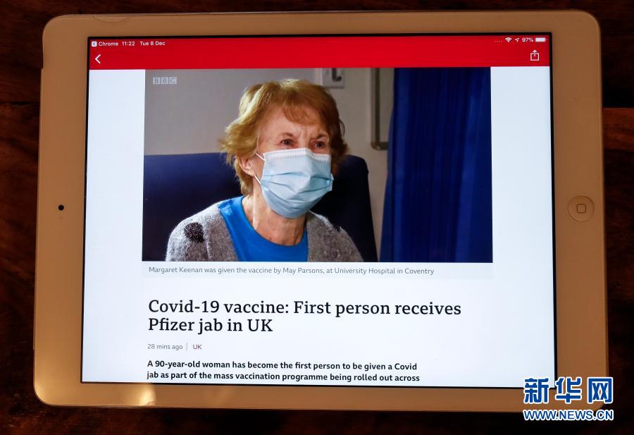 12月8日在英國(guó)倫敦拍攝的播放新聞的電腦屏幕顯示,90歲女子瑪格麗特·基南成為該國(guó)首位接種新冠疫苗的人。