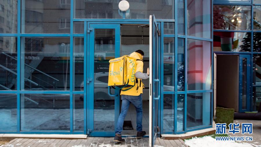 12月10日,在哈薩克斯坦首都努爾蘇丹,一名外賣小哥走進(jìn)一棟公寓樓為顧客送餐。新華社發(fā)(GLOVO公司供圖)